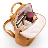 雨にも強いシンセティックレザー(合成皮革)を使用しました。小さめサイズで上品スタイルに。見た目以上に軽くて収納力があり(A4可)フロントポケットには「ことりっぷ」も入れられるので旅行中も便利です。ベルトアレンジでショルダーや肩掛けにもなり、ハンドルで手持ちもできます。内装はことりっぷ柄になっています。